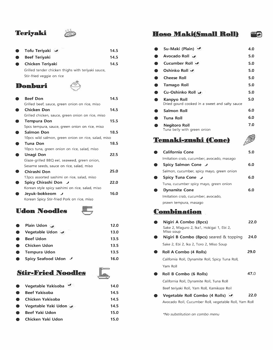 The menu features a variety of delectable options, including Teriyaki dishes such as Beef and Chicken, all priced at CA$14.50. Their Stir-Fried Noodles showcase options like Vegetable and Chicken Yakisoba, starting from CA$14.00. If you're looking for a fulfilling lunch, the Bento Box options are a must-try, offering a complete meal with sushi rolls, salad, and tempura for CA$16.50.