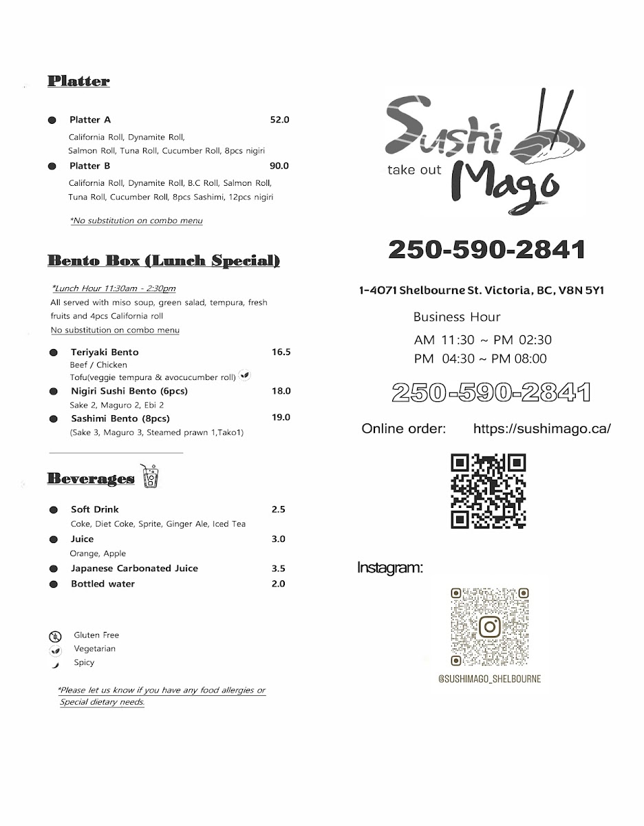 Introducing the menu at Sushi Mago is a delightful journey through authentic Japanese flavors nestled in Victoria’s Gordon Head area. Located at 4071 Shelbourne St, this cozy spot stands out for its fresh and high-quality sushi offerings, making it a favorite among locals.